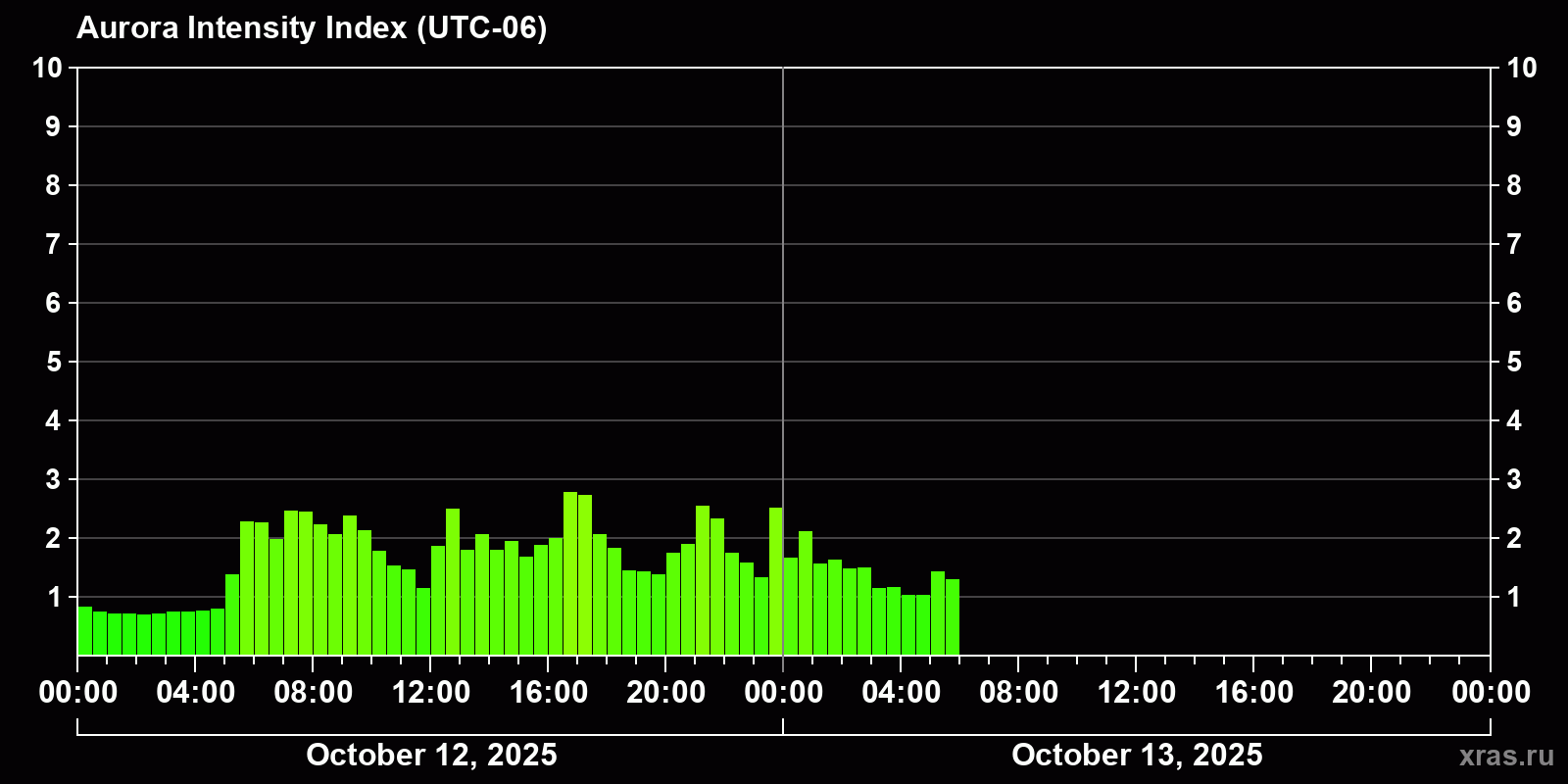 Изменения и часовой прогноз индекса интенсивности полярных сияний с 2025-10-09 по 2025-10-10