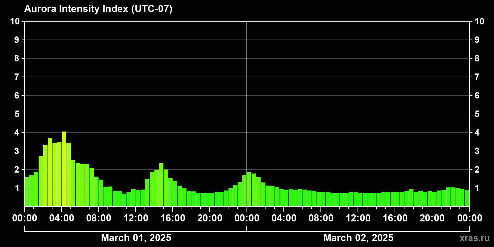 Changes in the auroral intensity index from 2025-03-01 to 2025-03-02 local time