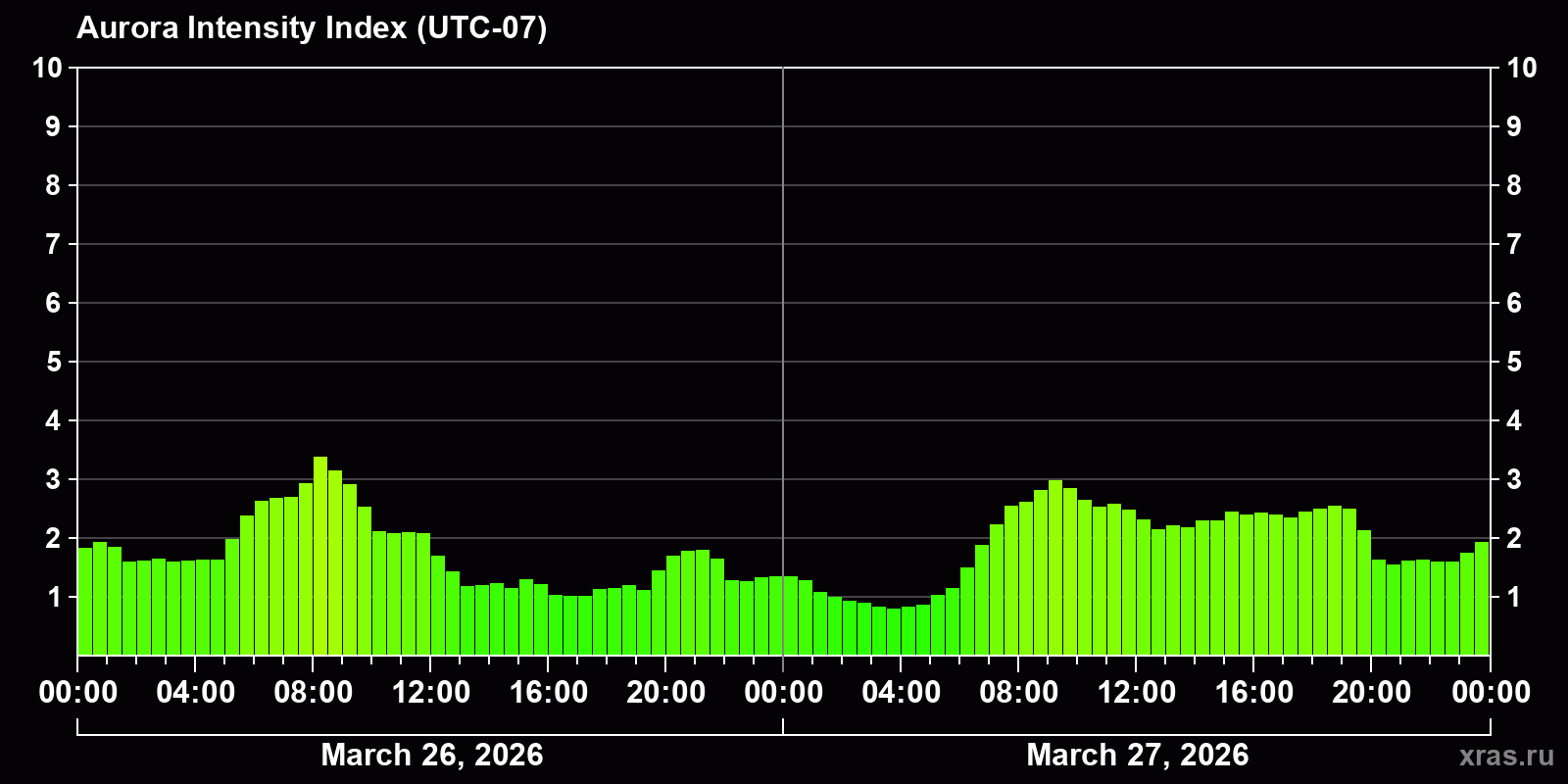Changes in the auroral intensity index from 2026-03-26 to 2026-03-27 local time