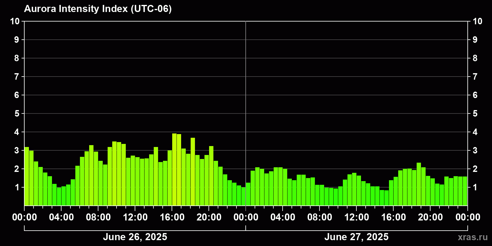 Changes in the auroral intensity index from 2025-06-26 to 2025-06-27 local time