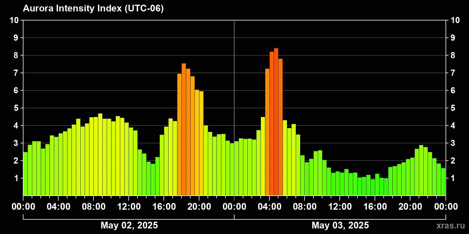 Changes in the auroral intensity index from 2025-05-02 to 2025-05-03 local time