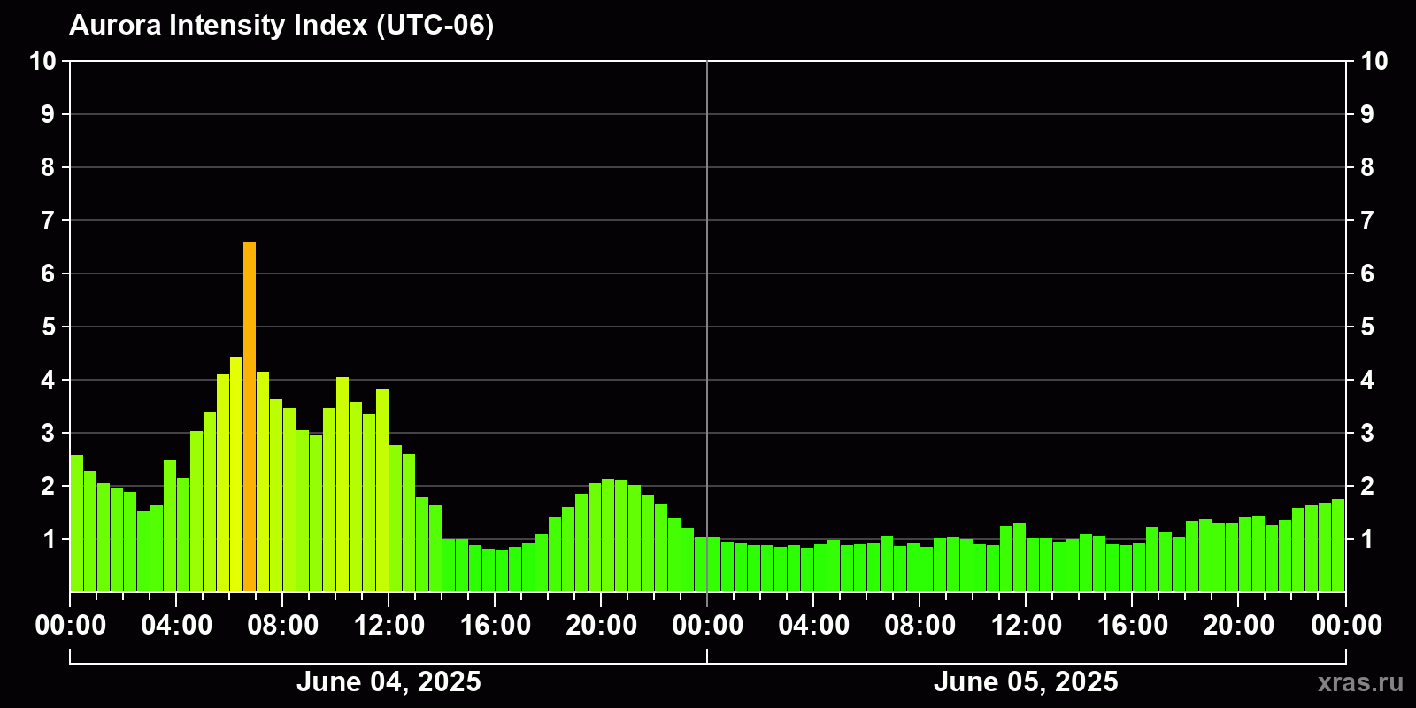 Changes in the auroral intensity index from 2025-06-04 to 2025-06-05 local time