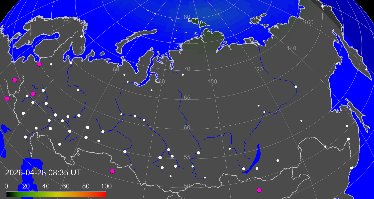 Auroral intensity index and theoretically possible latitude of observations for nighttime in the Estern Hemisphere