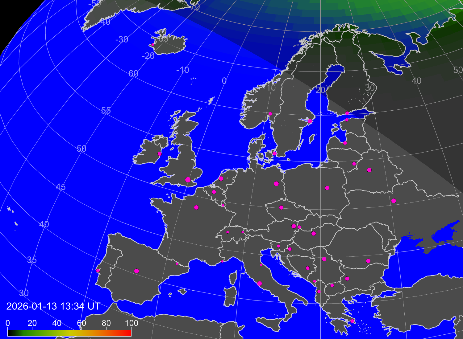 Вероятность полярных сияний в городах Европы