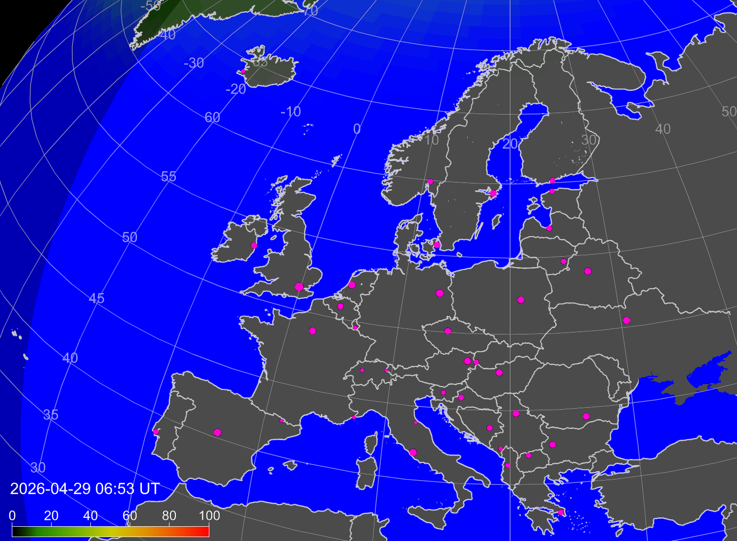 Auroral intensity index and theoretically possible latitude of observations for nighttime in the Estern Hemisphere