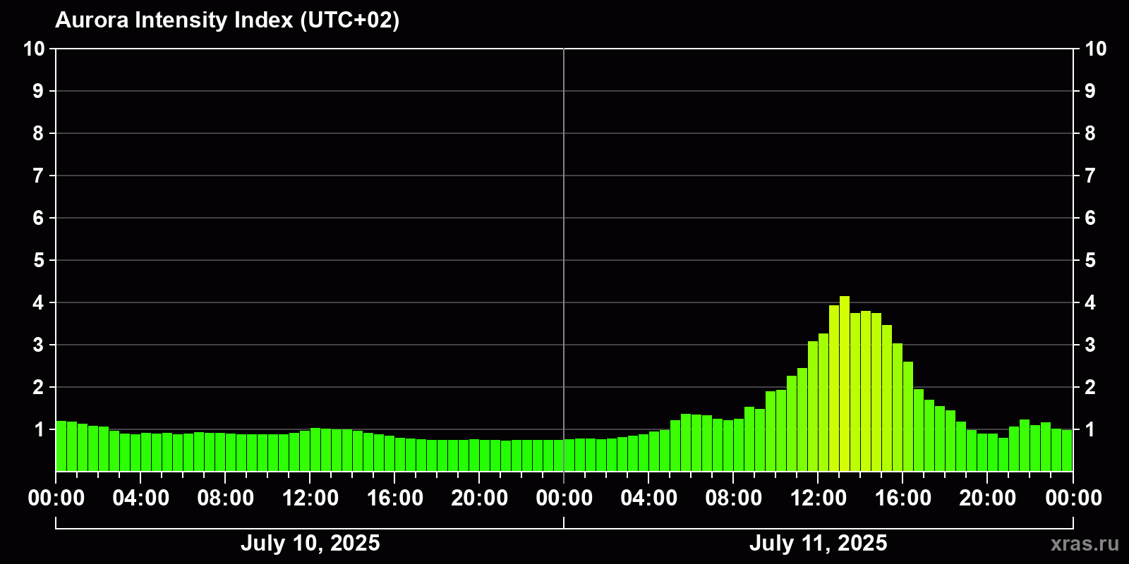 Changes in the auroral intensity index from 2025-07-10 to 2025-07-11 local time