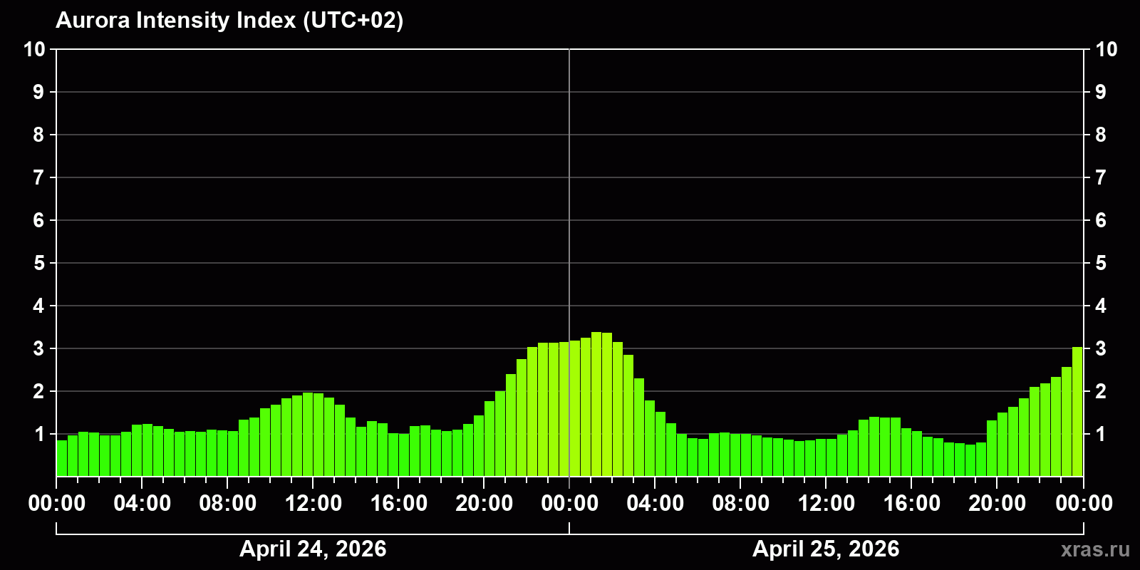 Changes in the auroral intensity index from 2026-04-24 to 2026-04-25 local time