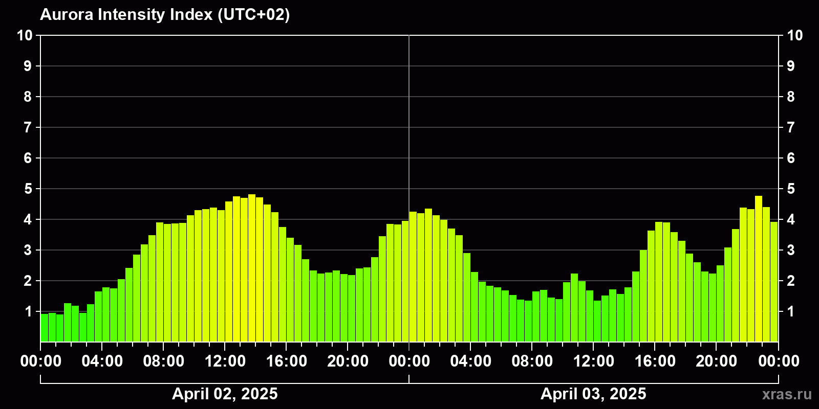 Auroral intensity index and the theoretically possible latitude of observations for nighttime in the Estern Hemisphere as of 2025-04-03 23:50 (end of day) local time