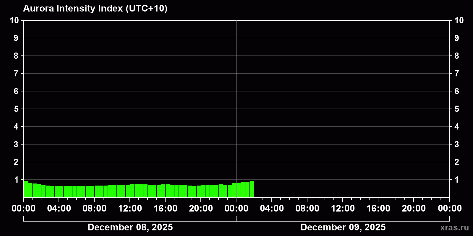 Изменения и часовой прогноз индекса интенсивности полярных сияний с 2025-12-06 по 2025-12-07