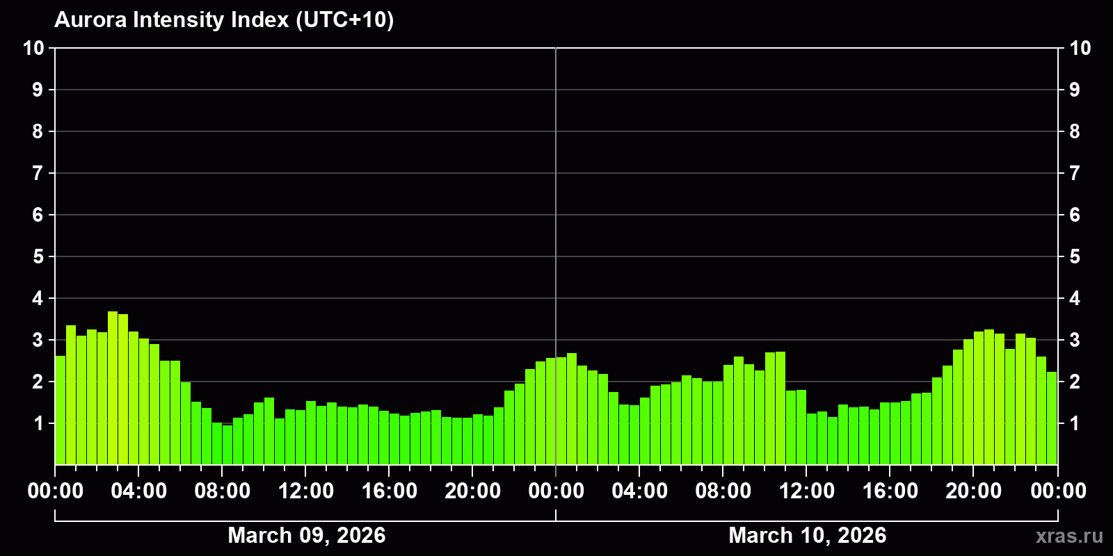 Changes in the auroral intensity index from 2026-03-09 to 2026-03-10 local time