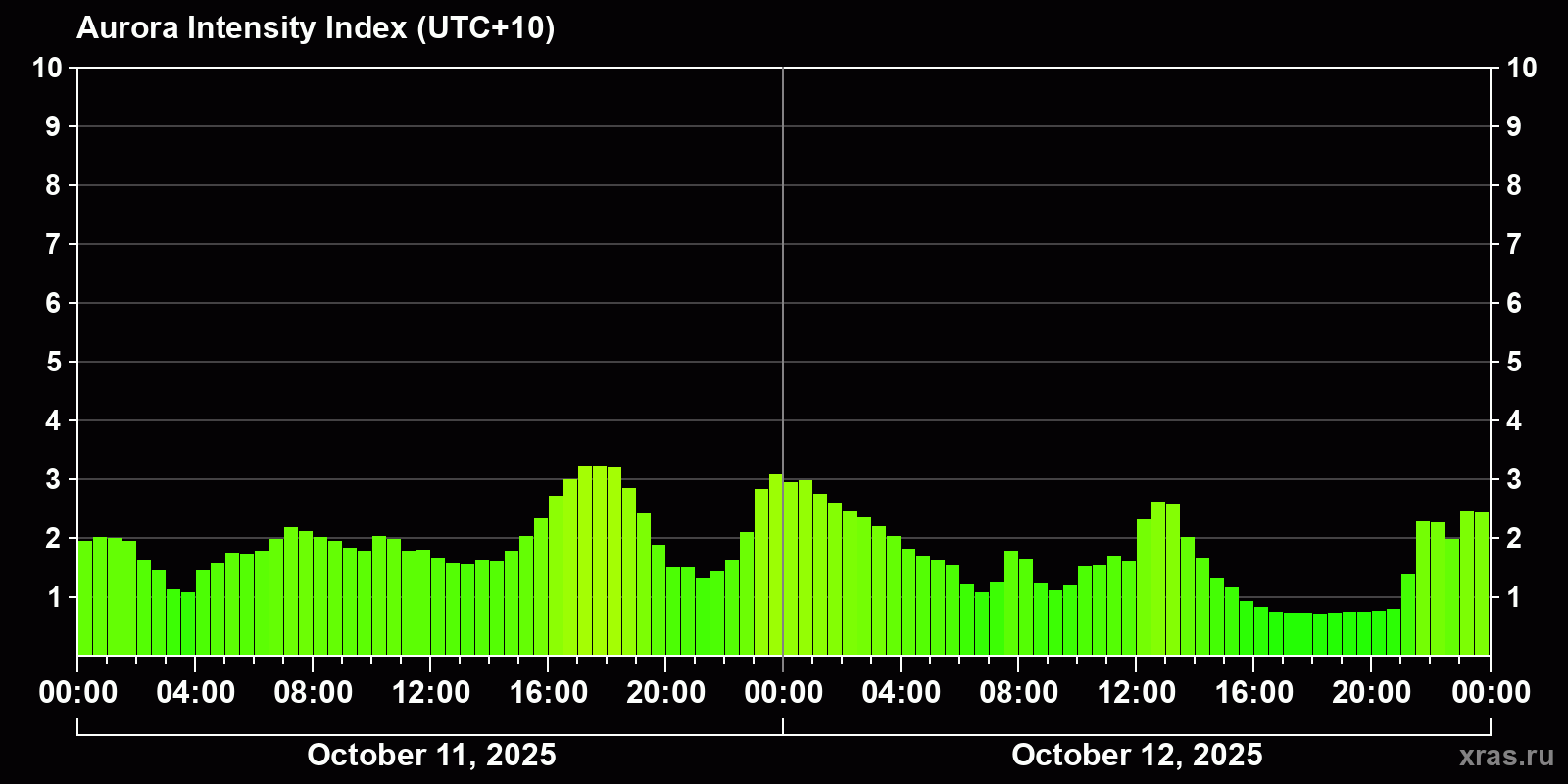 Changes in the auroral intensity index from 2025-10-11 to 2025-10-12 local time
