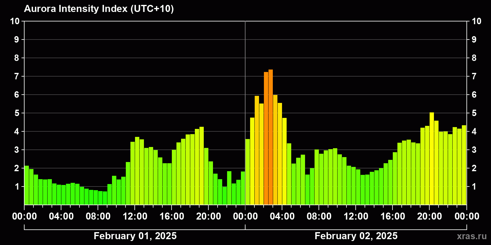 Changes in the auroral intensity index from 2025-02-01 to 2025-02-02 local time