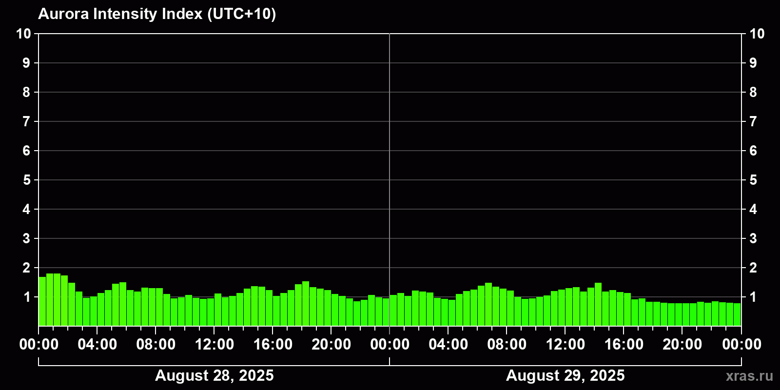 Changes in the auroral intensity index from 2025-08-28 to 2025-08-29 local time
