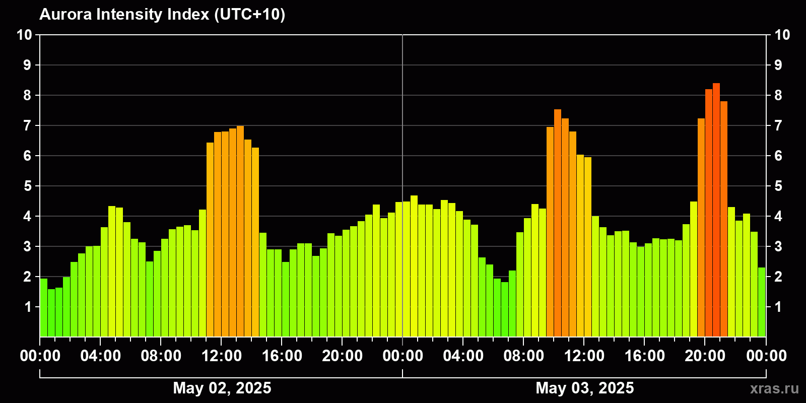 Changes in the auroral intensity index from 2025-05-02 to 2025-05-03 local time