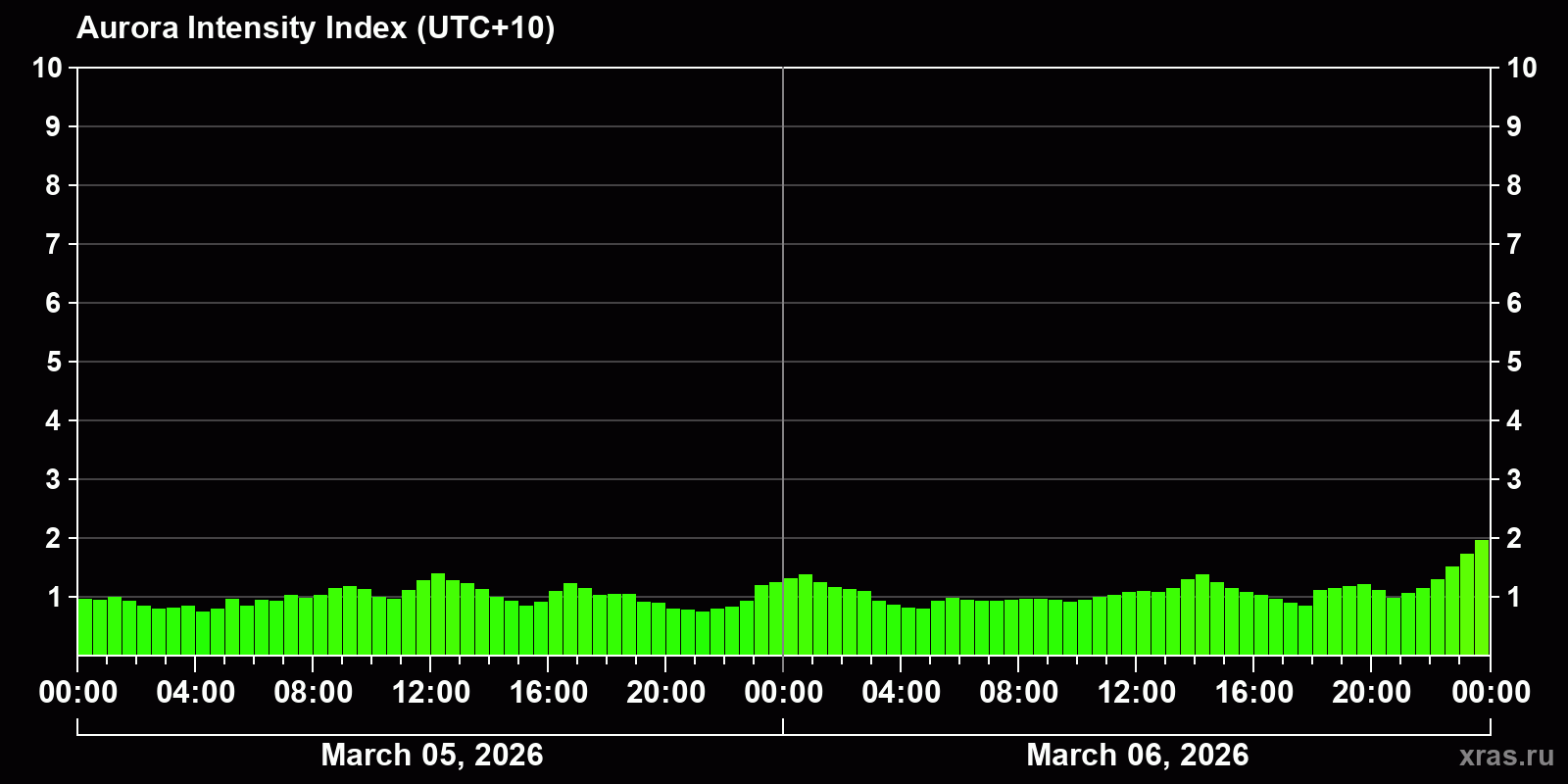 Changes in the auroral intensity index from 2026-03-05 to 2026-03-06 local time