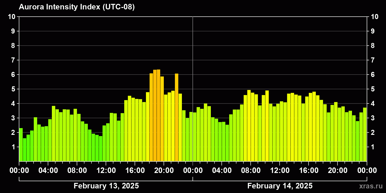 Auroral intensity index and the theoretically possible latitude of observations for nighttime in the Western Hemisphere as of 2025-02-14 23:54 (end of day) local time