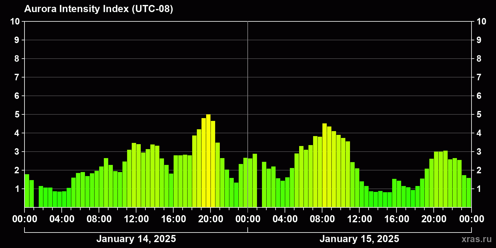 Changes in the auroral intensity index from 2025-01-14 to 2025-01-15 local time