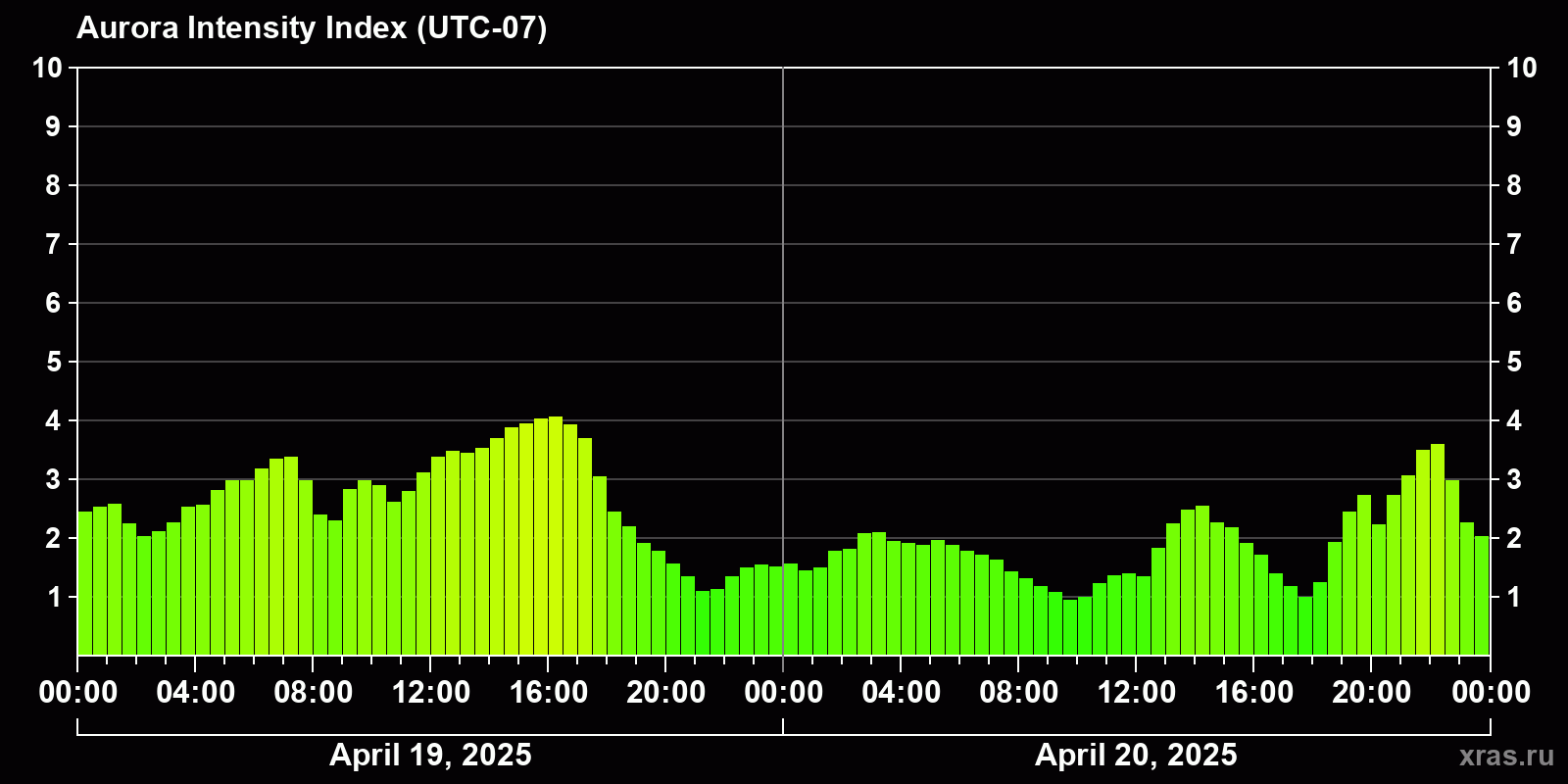 Changes in the auroral intensity index from 2025-04-19 to 2025-04-20 local time