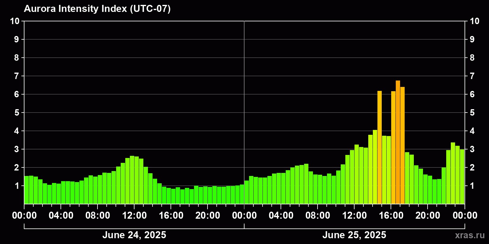 Auroral intensity index and the theoretically possible latitude of observations for nighttime in the Western Hemisphere as of 2025-06-25 23:51 (end of day) local time