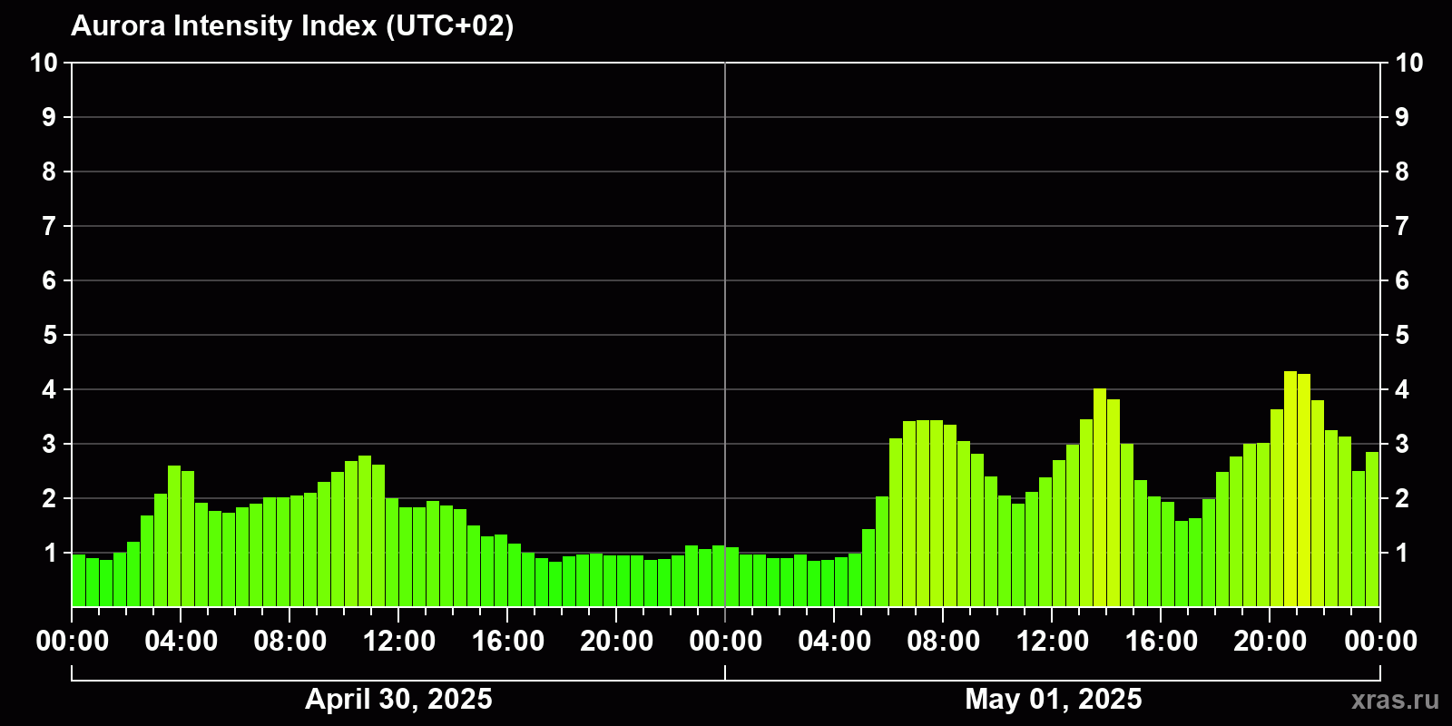 Auroral intensity index and the theoretically possible latitude of observations for nighttime in the Estern Hemisphere as of 2025-05-01 23:53 (end of day) local time