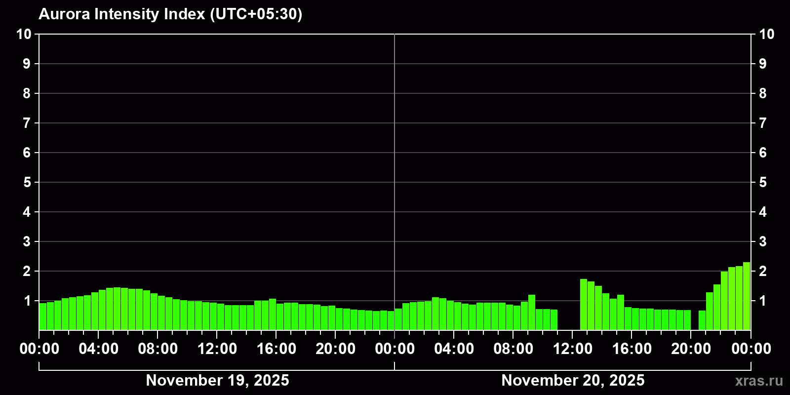 Auroral intensity index and the theoretically possible latitude of observations for nighttime in the Estern Hemisphere as of 2025-11-20 23:56 (end of day) local time