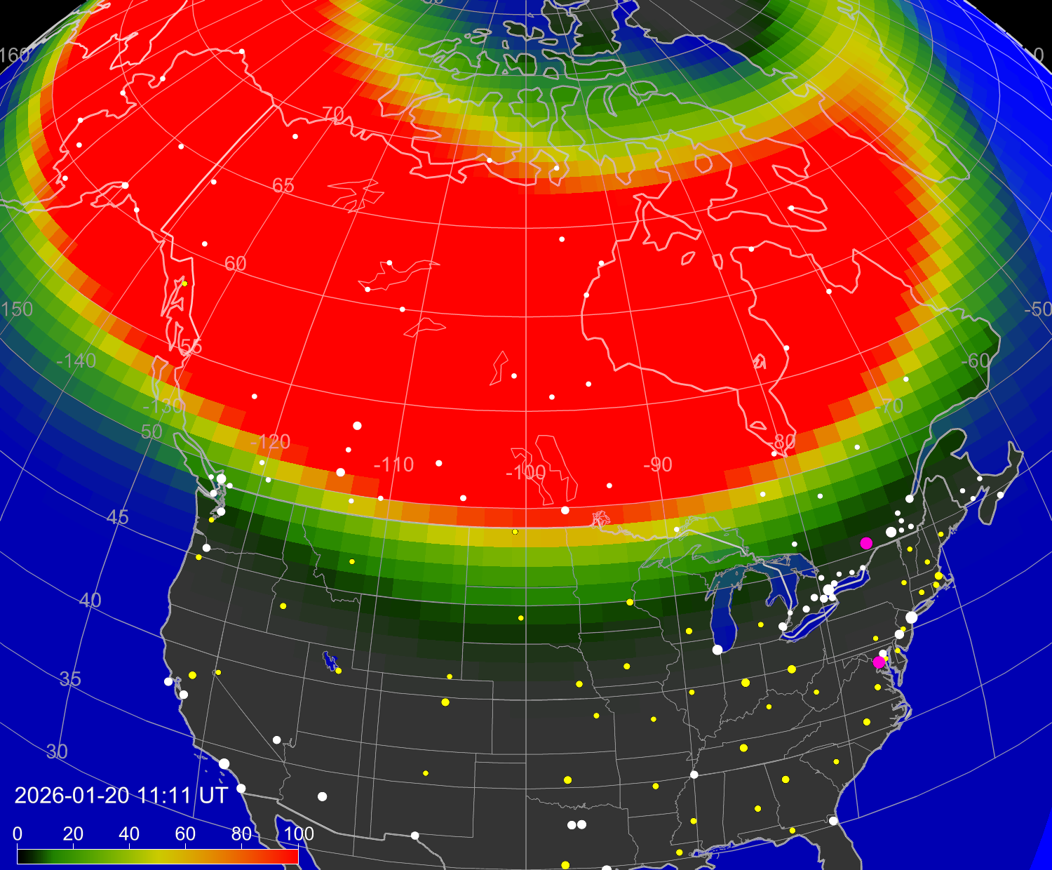 Изменения и часовой прогноз индекса интенсивности полярных сияний с 2026-01-20 по 2026-01-21