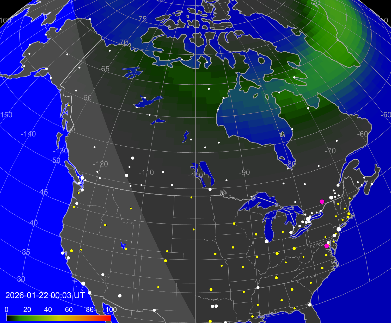 Индекс интенсивности полярных сияний и теоретически возможная широта наблюдений для ночного времени в западном полушарии