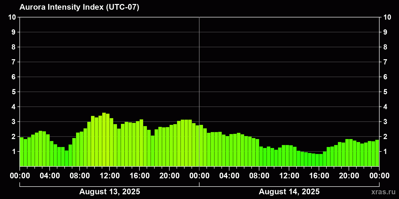 Changes in the auroral intensity index from 2025-08-13 to 2025-08-14 local time