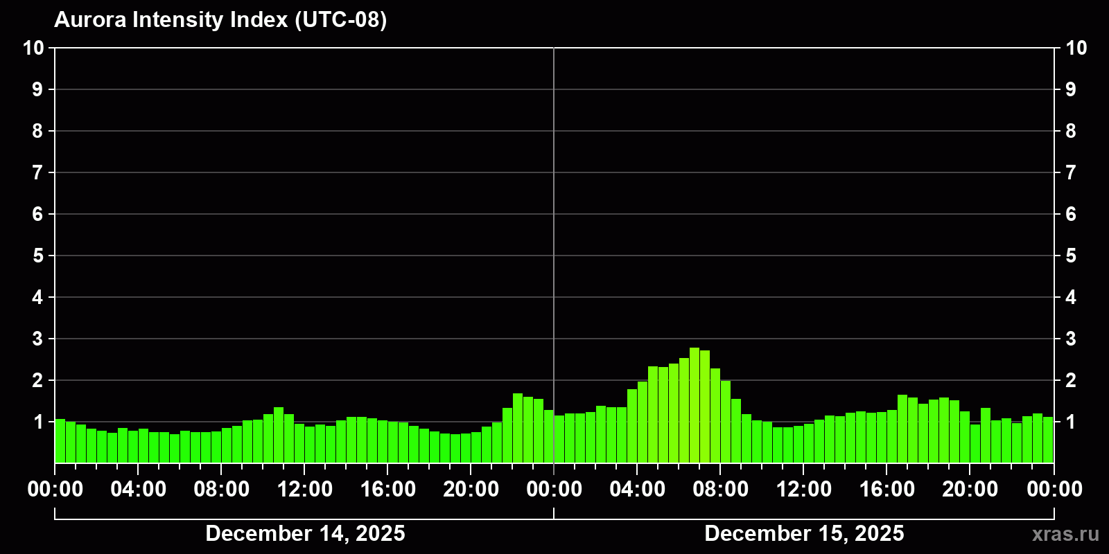 Changes in the auroral intensity index from 2025-12-14 to 2025-12-15 local time