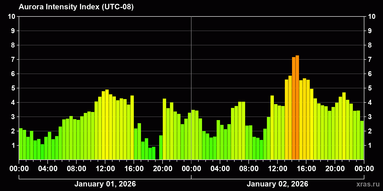 Changes in the auroral intensity index from 2026-01-01 to 2026-01-02 local time
