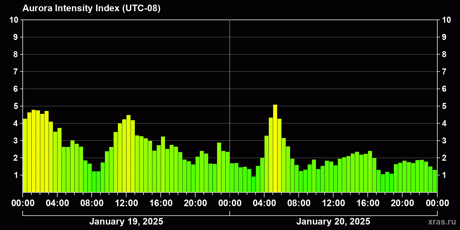 Auroral intensity index and the theoretically possible latitude of observations for nighttime in the Western Hemisphere as of 2025-01-20 23:45 (end of day) local time