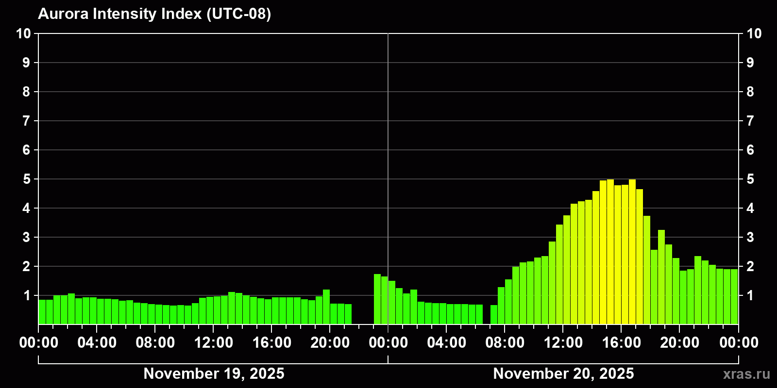 Changes in the auroral intensity index from 2025-11-19 to 2025-11-20 local time