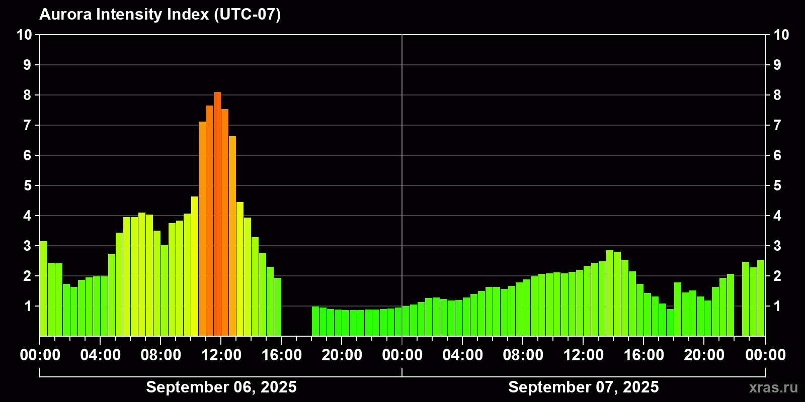 Auroral intensity index and the theoretically possible latitude of observations for nighttime in the Western Hemisphere as of 2025-09-07 23:53 (end of day) local time