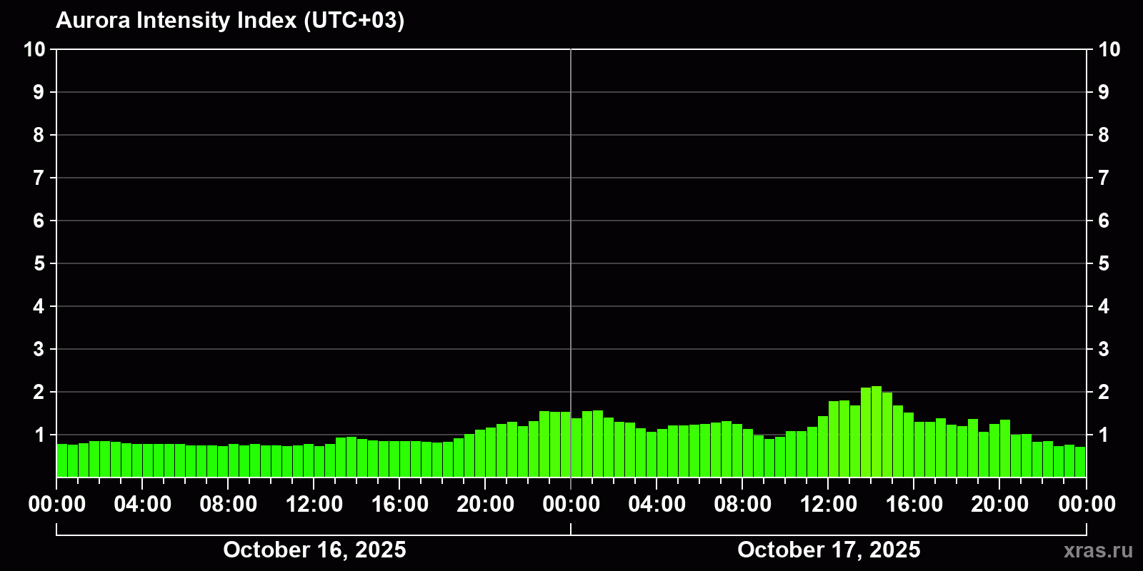 Changes in the auroral intensity index from 2025-10-16 to 2025-10-17 local time