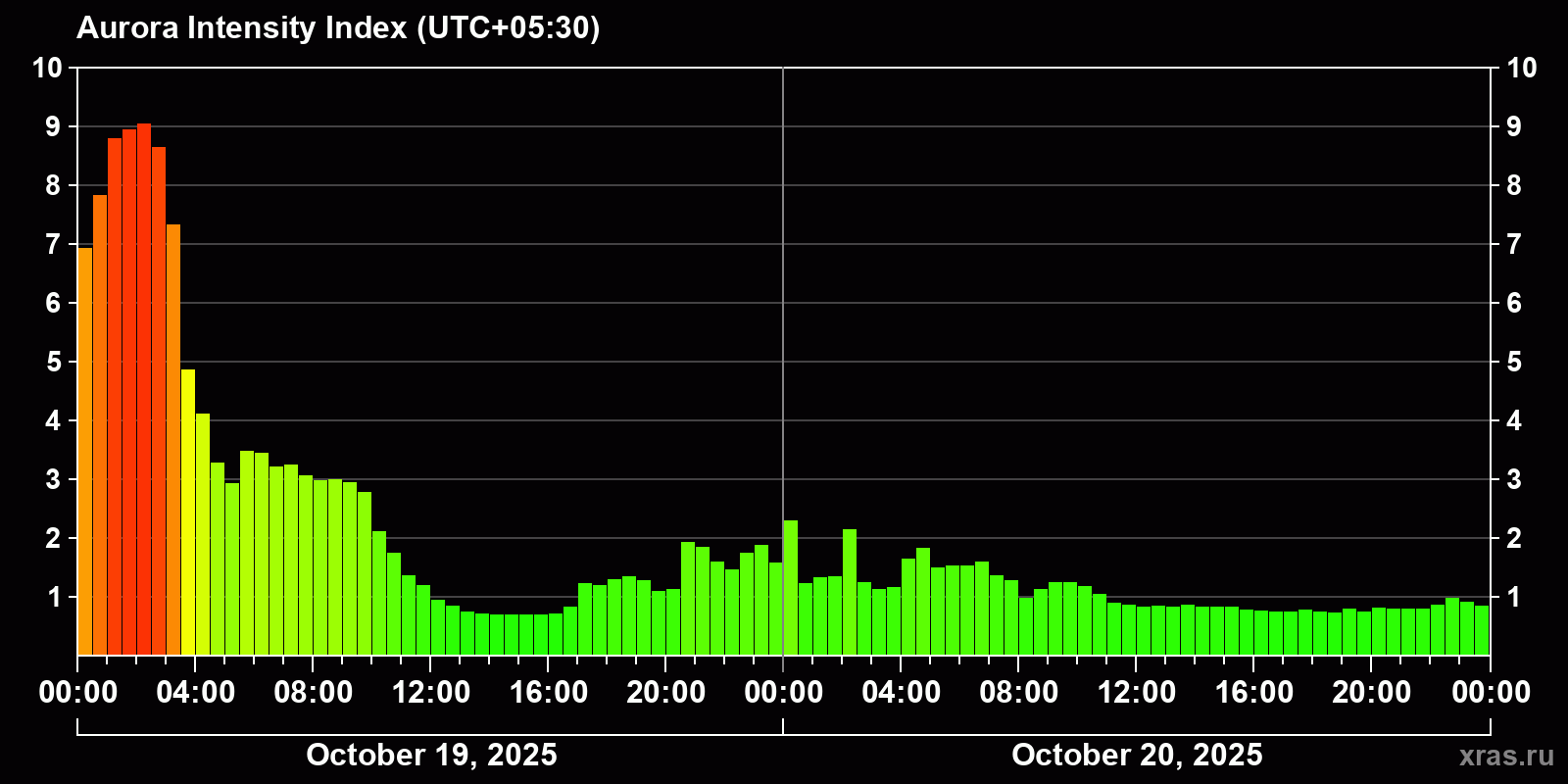 Auroral intensity index and the theoretically possible latitude of observations for nighttime in the Estern Hemisphere as of 2025-10-20 23:57 (end of day) local time