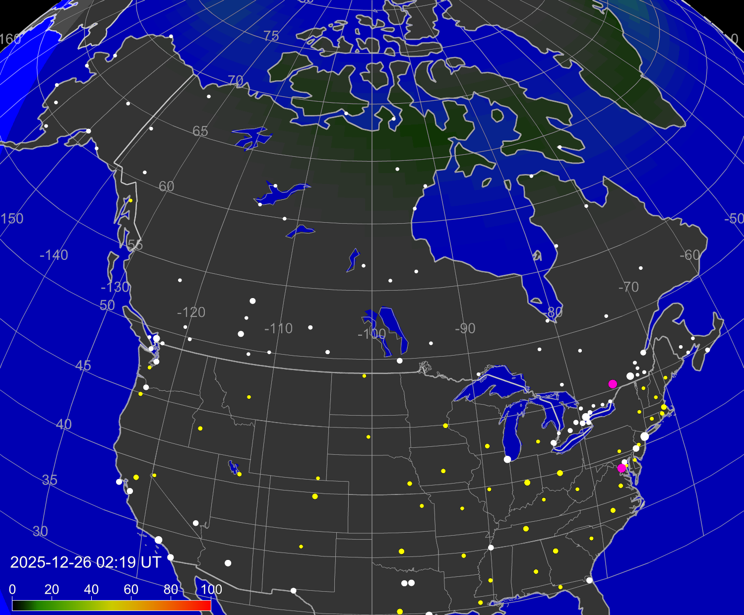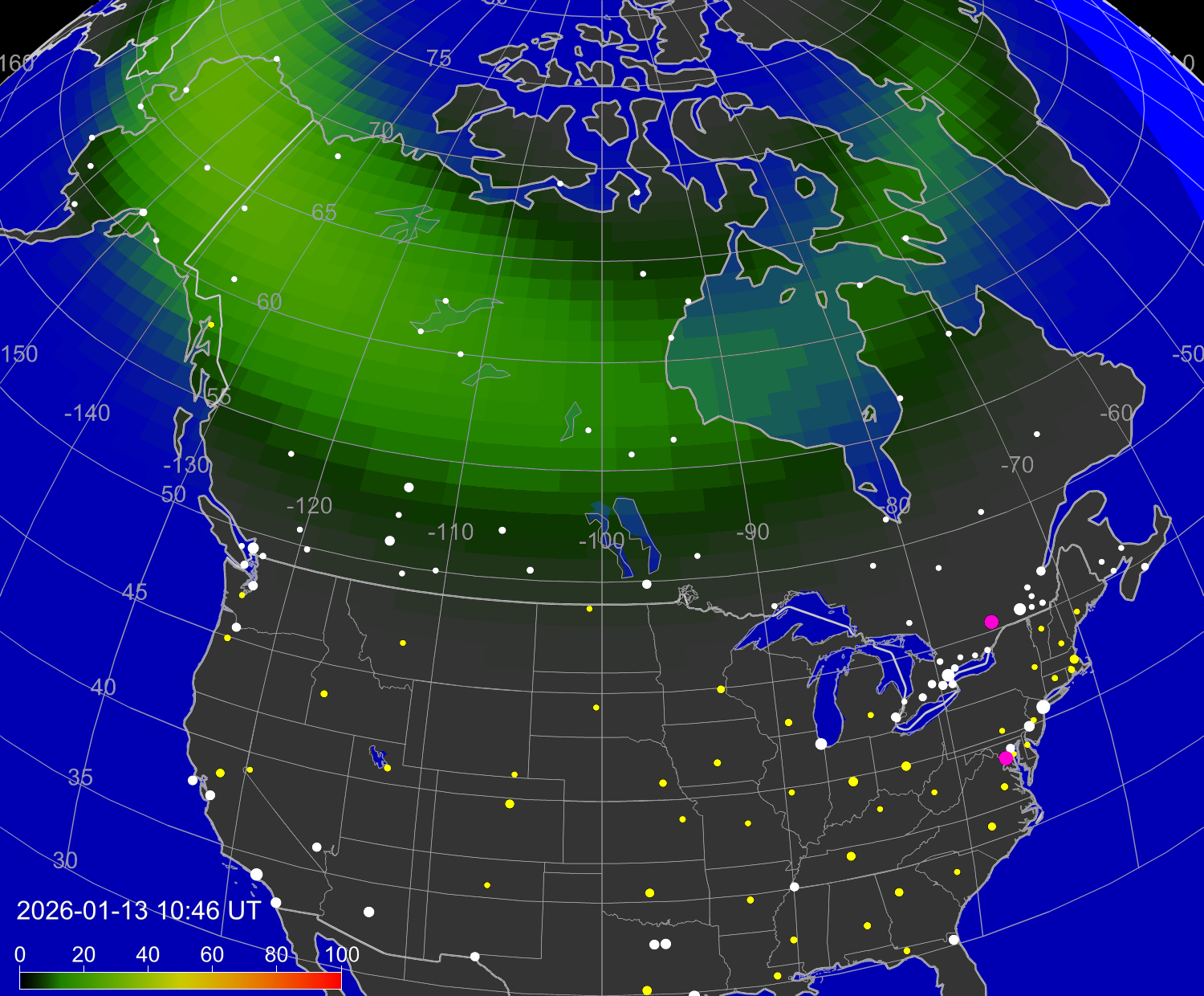 Вероятность полярных сияний в городах Канады