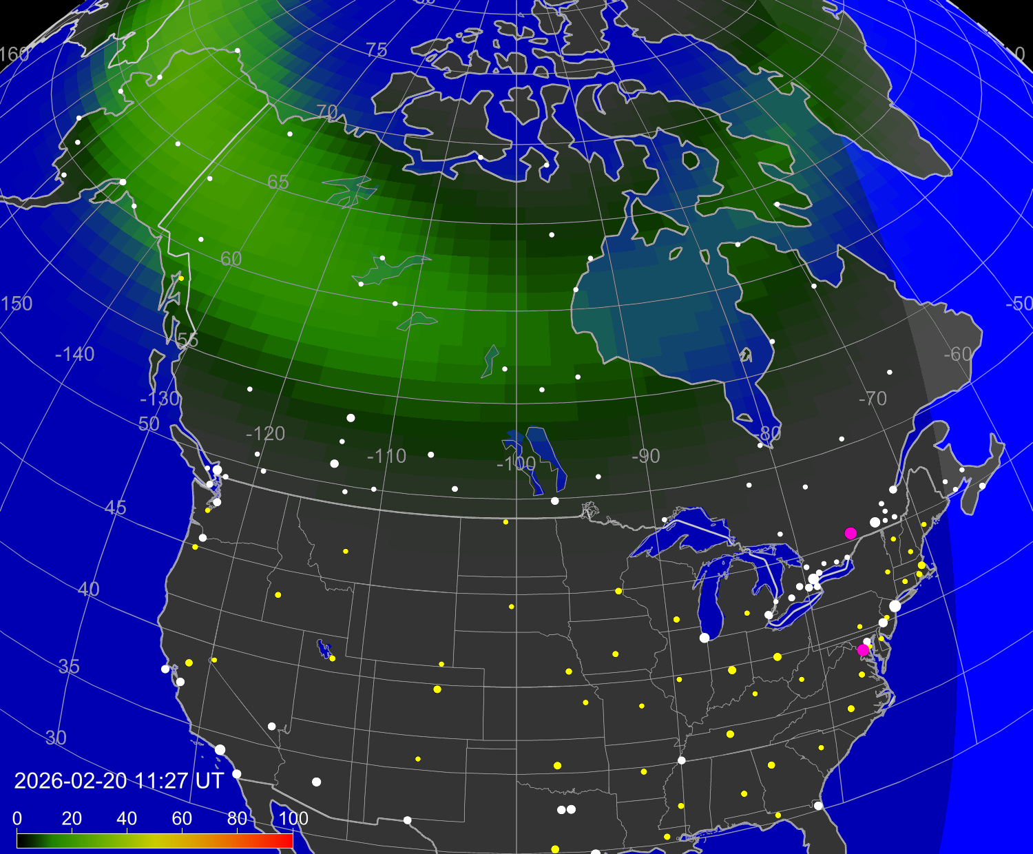 Изменения и часовой прогноз индекса интенсивности полярных сияний с 2026-02-18 по 2026-02-19