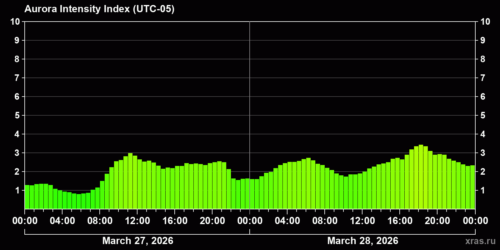 Auroral intensity index and the theoretically possible latitude of observations for nighttime in the Western Hemisphere as of 2026-03-28 23:51 (end of day) local time
