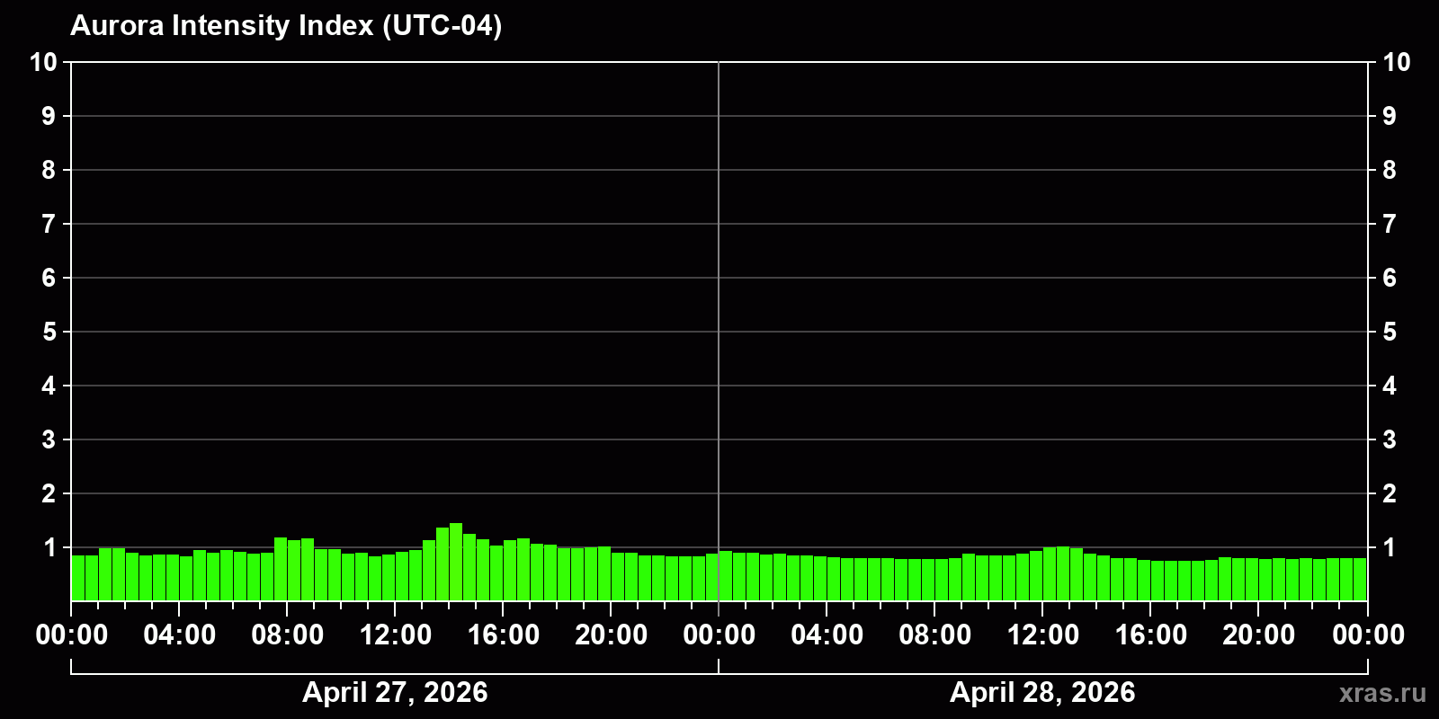 Auroral intensity index and the theoretically possible latitude of observations for nighttime in the Western Hemisphere as of 2026-04-28 23:55 (end of day) local time
