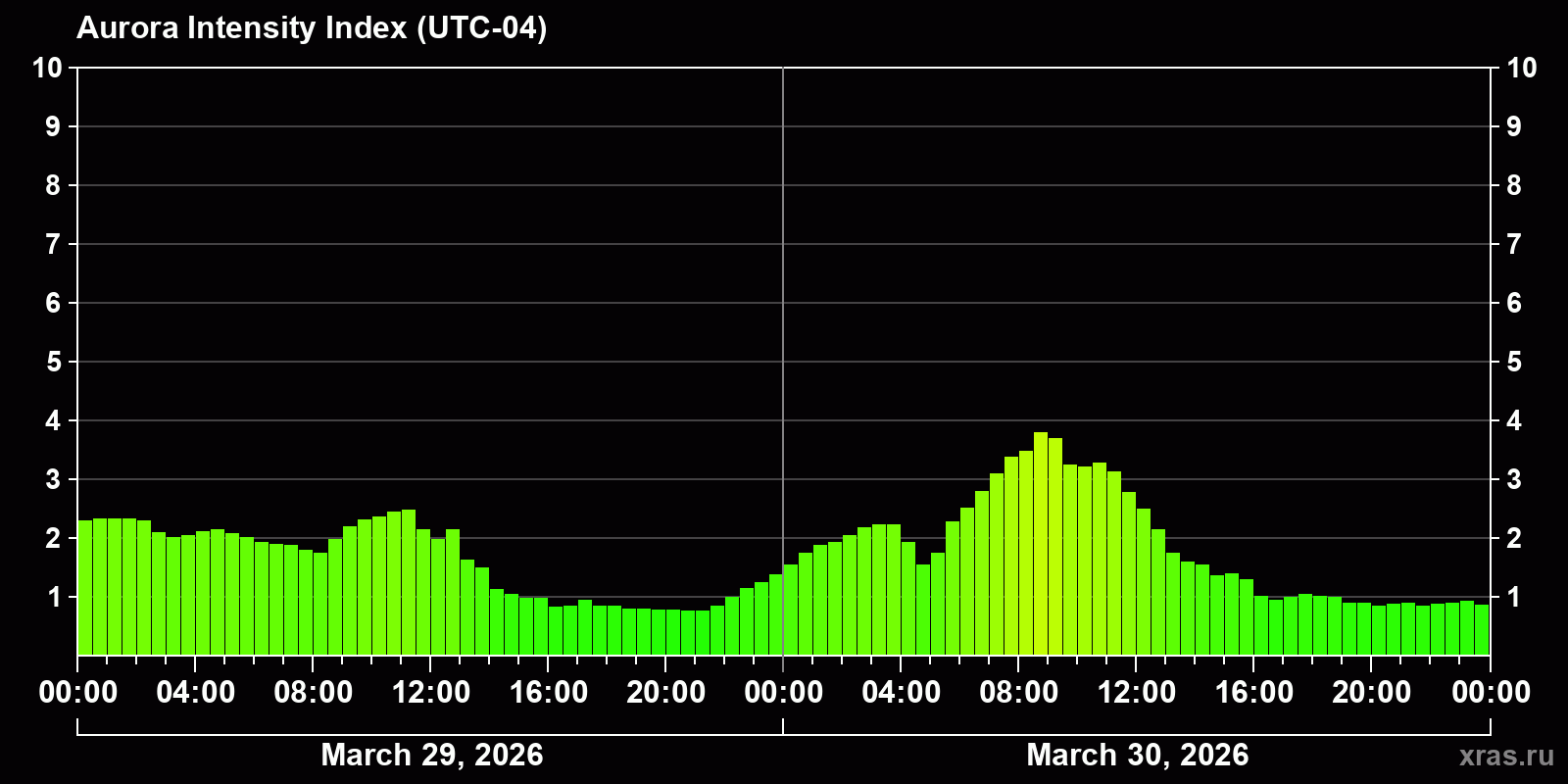 Changes in the auroral intensity index from 2026-03-29 to 2026-03-30 local time