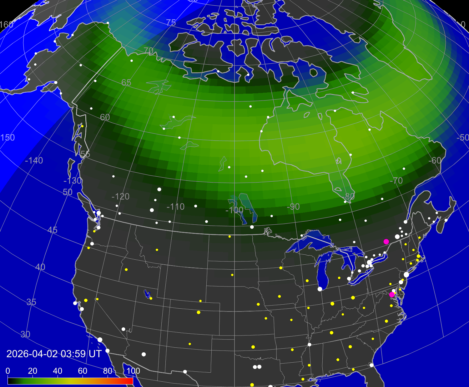 Вероятность полярных сияний в городах США