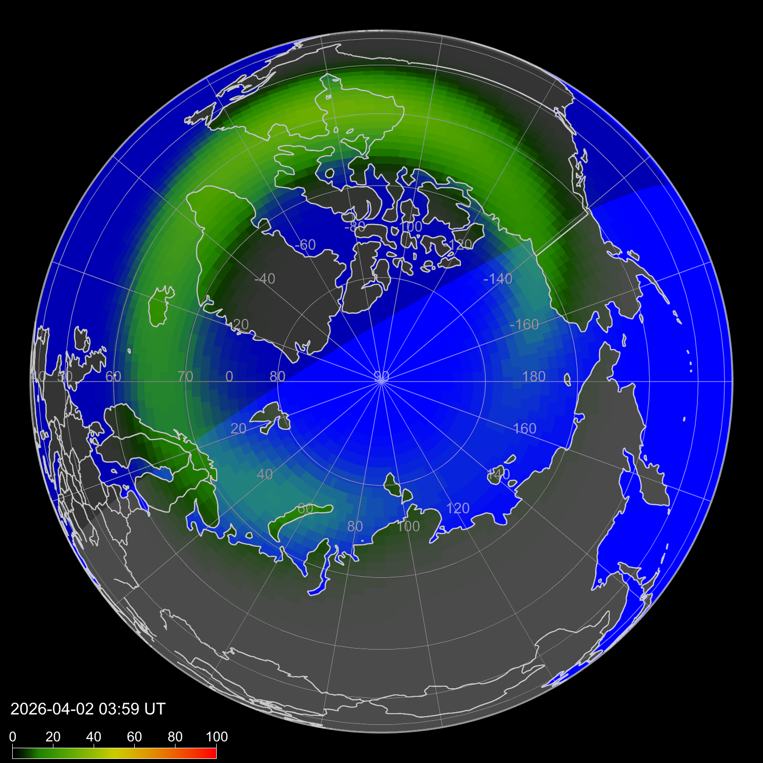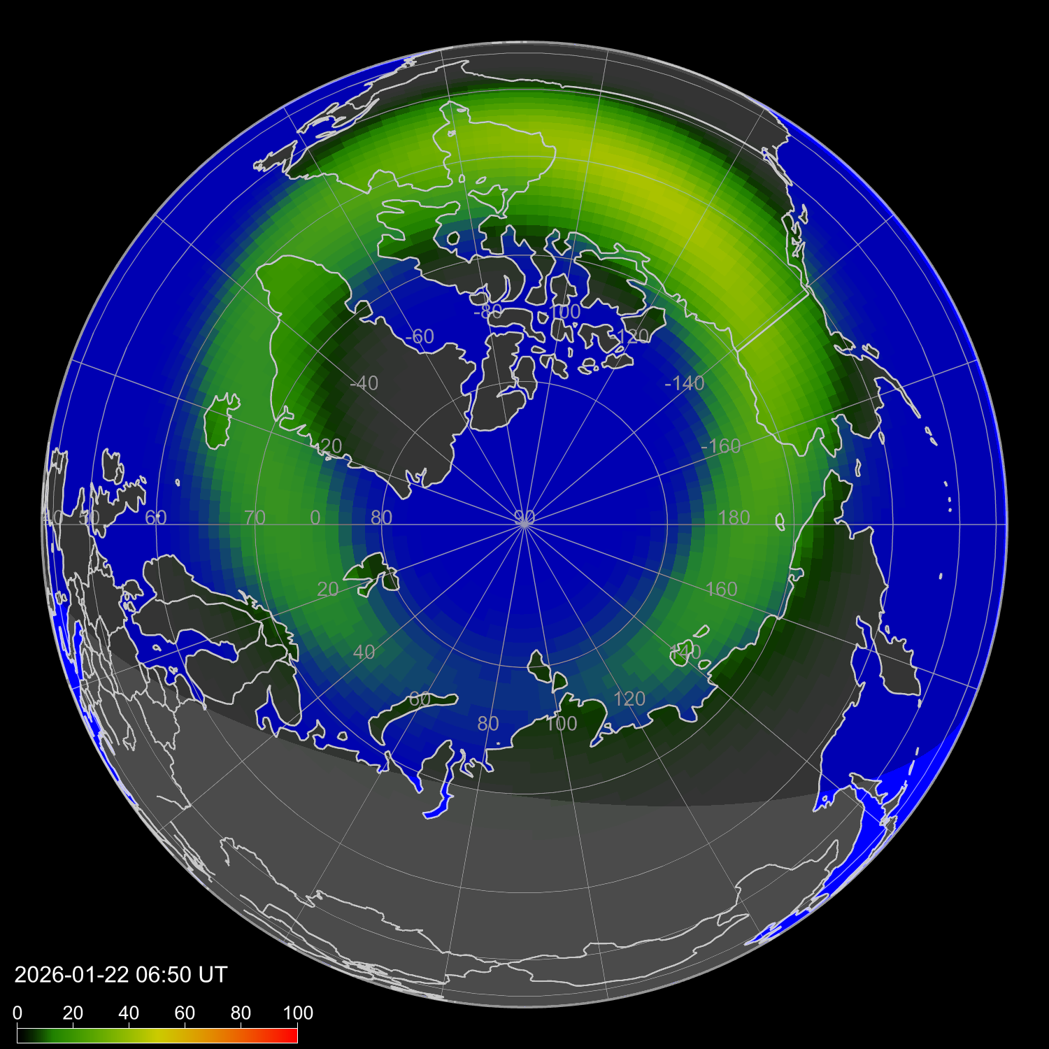 Индекс интенсивности полярных сияний и теоретически возможная широта наблюдений для ночного времени в западном полушарии