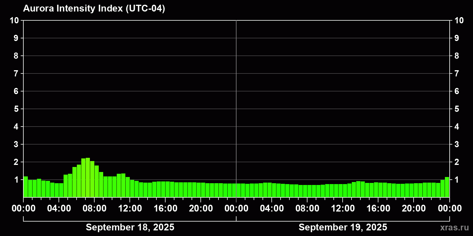 Auroral intensity index and the theoretically possible latitude of observations for nighttime in the Western Hemisphere as of 2025-09-19 23:51 (end of day) local time