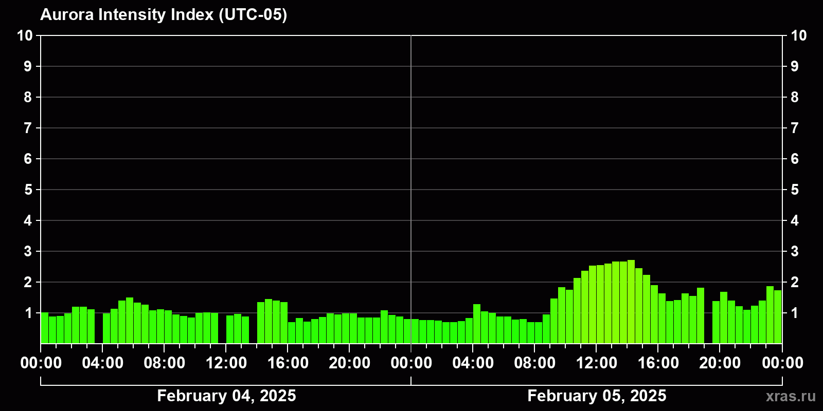 Changes in the auroral intensity index from 2025-02-04 to 2025-02-05 local time