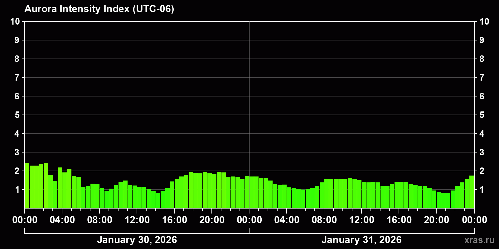 Changes in the auroral intensity index from 2026-01-30 to 2026-01-31 local time