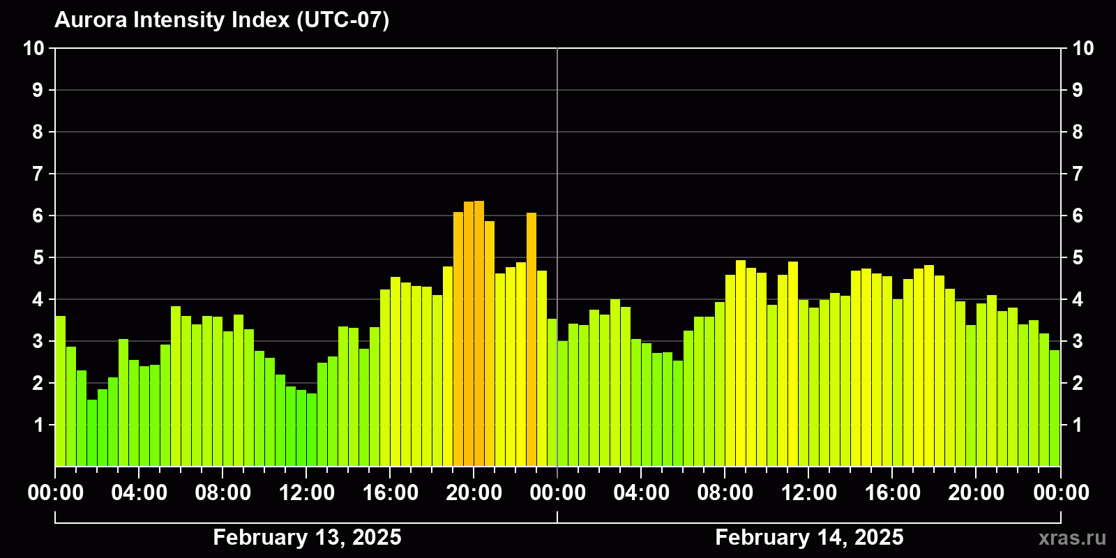 Auroral intensity index and the theoretically possible latitude of observations for nighttime in the Western Hemisphere as of 2025-02-14 23:54 (end of day) local time