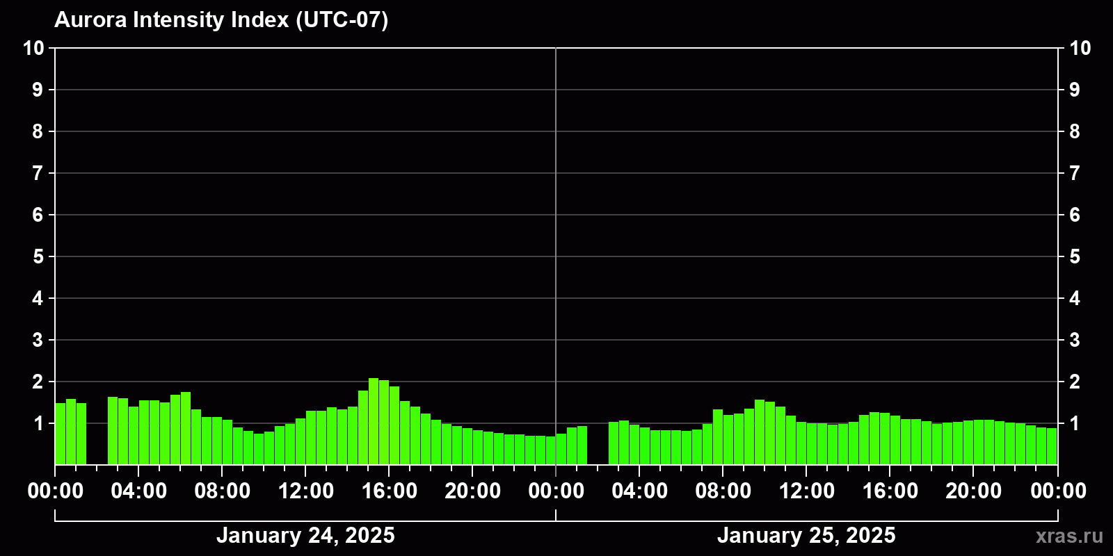 Changes in the auroral intensity index from 2025-01-24 to 2025-01-25 local time