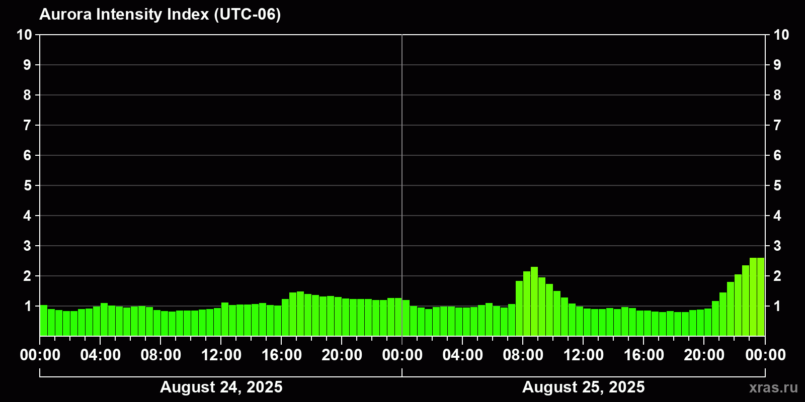 Auroral intensity index and the theoretically possible latitude of observations for nighttime in the Western Hemisphere as of 2025-08-25 23:57 (end of day) local time