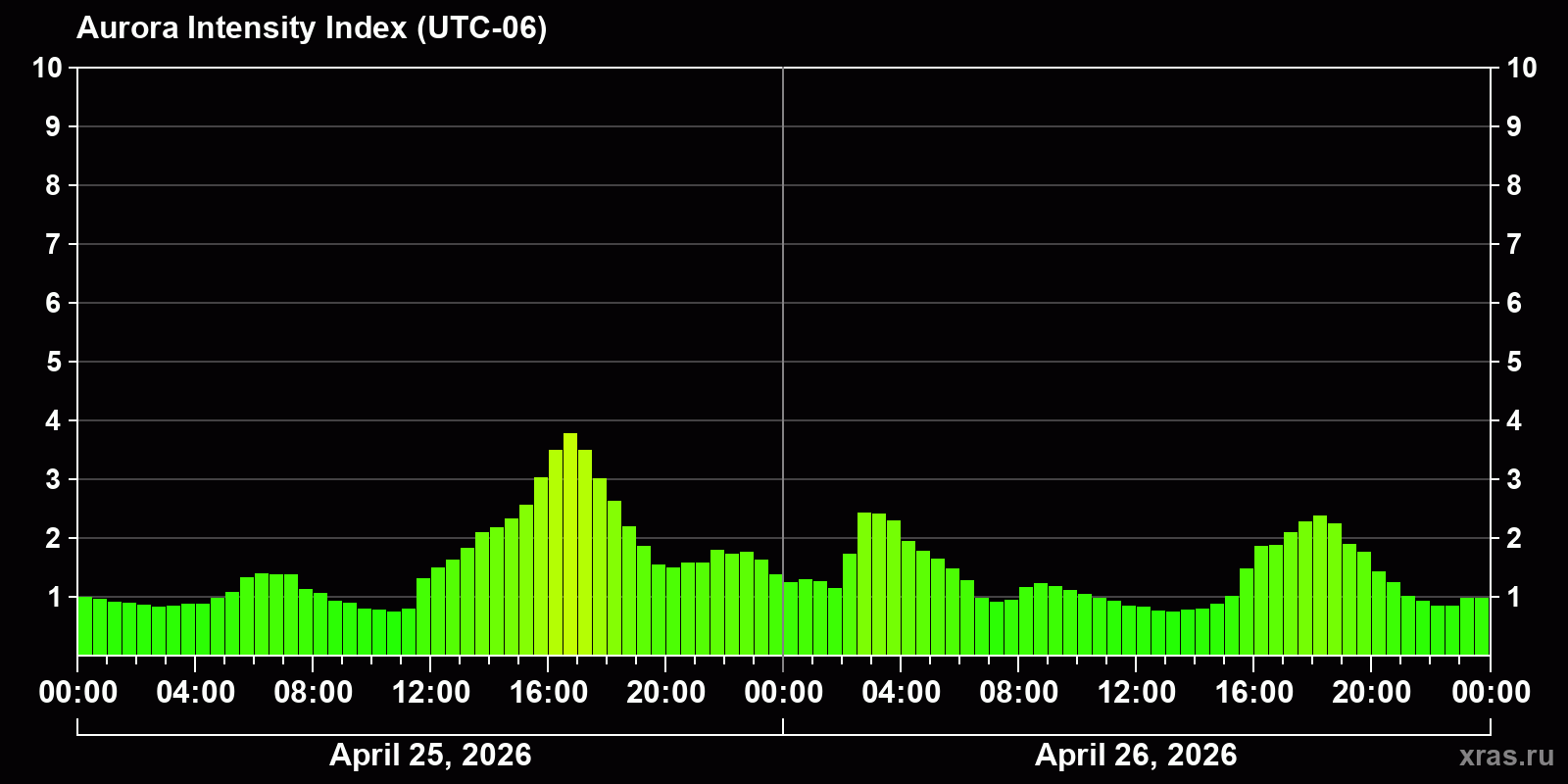 Changes in the auroral intensity index from 2026-04-25 to 2026-04-26 local time