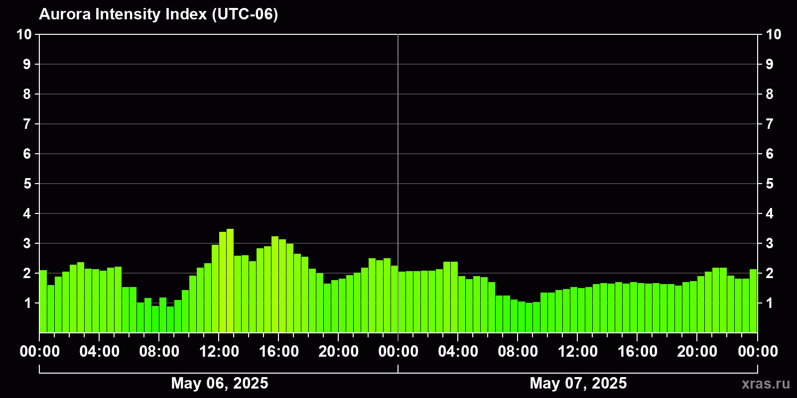 Auroral intensity index and the theoretically possible latitude of observations for nighttime in the Western Hemisphere as of 2025-05-07 23:54 (end of day) local time